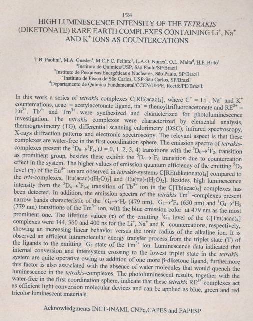 PAOLINI, T.B.; GUEDES, M.A.; FELINTO, M.C.F.C.; NUNES, L.A.O.; MALTA, O.L.; BRITO, H.F. High luminescence intensity of the Tetrakis (Diketonate) rare earth complexes containing Lisup(+), Nasup(+) and Ksup(+) ions as countercations. In: RARE EARTH CONFERENCE 2010, 2010. Resumos... p. 24. Disponível em: http://repositorio.ipen.br/handle/123456789/21275. Acesso em: 20 Mar 2026.